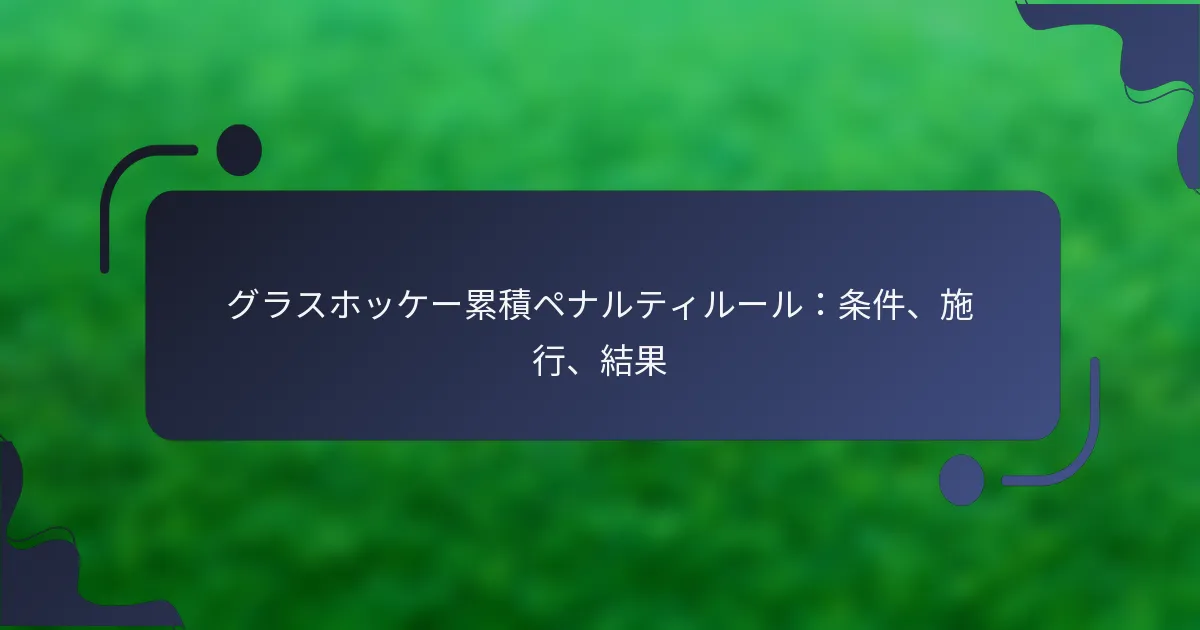 グラスホッケーにおける累積ペナルティは、試合中に選手が繰り返し違反を犯すことを抑制し、公正なプレーと競争を確保するために実施されます。このシステムは、ルールを複数回違反した選手に対して厳しい結果を課し、選手の行動を監視する審判によって施行されます。選手がペナルティを累積するにつれて、試合からの一時的な出場停止など、より厳しい懲戒処分を受ける可能性があります。 グラスホッケーにおける累積ペナルティとは何ですか? グラスホッケーにおける累積ペナルティは、試合中に選手が繰り返し違反を犯すことでペナルティを受けるシステムを指します。このルールは、反則行為を抑制し、ゲームのルールを一貫して違反する選手に対して厳しい結果を課すことで、公正な競争を維持することを目的としています。 累積ペナルティの定義 累積ペナルティは、試合中に選手が受けるペナルティの数を追跡するグラスホッケーのメカニズムです。選手が一定の違反の閾値に達すると、一時的に試合から外されるなど、より厳しい結果に直面する可能性があります。このシステムは、選手間の規律とスポーツマンシップを促進することを目的としています。 累積ペナルティのルールは通常、選手の行動を監視し、違反を記録する試合の公式によって施行されます。目標は、選手がルールを守る重要性と自らの行動の潜在的な影響を理解することです。 累積ペナルティルールの構成要素 違反の閾値:さらなる結果を引き起こす特定のペナルティ数。 ペナルティの種類:累積に寄与する異なるカテゴリーの反則。 施行:ペナルティを監視し記録する公式の役割。 累積ペナルティの閾値は、リーグや統括団体によって異なることが多いですが、一般的には2から4のペナルティの範囲です。この制限を超えた選手は、指定された期間の出場停止を求められることがあり、チームのパフォーマンスに影響を与える可能性があります。 公式は、各選手の違反を追跡することによって累積ペナルティのルールを施行する責任があります。この監視により、選手は試合中の行動に対して責任を持つことが確保されます。 ペナルティにつながる違反の分類 累積ペナルティにつながる違反は、軽微な反則、大きな反則、そして不正行為など、いくつかのタイプに分類できます。軽微な反則には、スティックの干渉や妨害のような行為が含まれる一方で、大きな反則は危険なプレーや攻撃的な行動を伴う可能性があります。 不正行為のペナルティは、繰り返しの軽微な違反やスポーツマンシップに反する行動から生じることが多いです。各タイプの違反は選手の総ペナルティ数に寄与するため、選手は自らの行動がフィールド上でどのような影響を及ぼすかを理解することが重要です。 累積ペナルティの一般的な別名 ペナルティの累積 ペナルティカウント 懲戒ペナルティ 累積ペナルティは、さまざまな文脈でペナルティの累積やペナルティカウントと呼ばれることがあります。これらの用語は、試合中に選手が犯す違反の継続的な集計を強調しています。これらの別名を理解することで、選手やコーチはルールやペナルティに関連する結果について効果的にコミュニケーションを取ることができます。 累積ペナルティの文脈例 例えば、選手が試合の前半で3回の軽微な反則を犯した場合、累積ペナルティについて警告されることがあります。4回目の違反を犯すと、試合の一部で出場停止となり、チームの戦略やパフォーマンスに影響を与える可能性があります。 別の例として、選手がスポーツマンシップに反する行動で複数回警告を受けた後に不正行為のペナルティを受けることがあります。この行動は、累積ペナルティにカウントされるだけでなく、フィールド上での不適切な行動の結果について他の選手への警告にもなります。 グラスホッケーにおける累積ペナルティを引き起こす条件は何ですか? グラスホッケーにおける累積ペナルティは、選手が試合中に複数の違反を犯すことで発生し、懲戒処分が強化されます。累積の具体的な条件は、違反の性質、発生頻度、そして公式によるルールの施行に依存します。