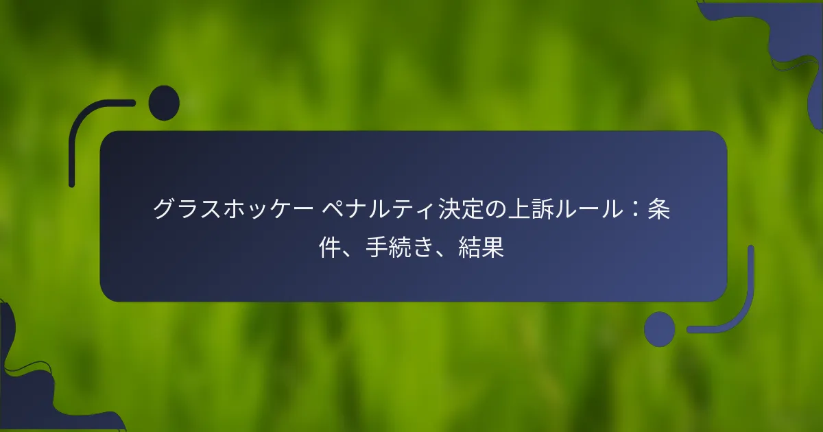 グラスホッケーにおいて、ペナルティ決定に対する異議申し立ては、資格基準や提出期限を含む特定の条件を遵守する必要があります。異議申し立てが適切に考慮されるためには、構造化されたプロセスに従う必要があります。これは通常、試合の決定から生じます。このような異議申し立ての結果は、試合に大きな影響を与える可能性があり、元のペナルティを支持または覆すことができ、選手の資格にも影響を及ぼします。 グラスホッケーのペナルティ決定に対する異議申し立ての条件は何ですか? グラスホッケーのペナルティ決定に異議を申し立てるためには、資格基準、提出期限、必要な書類を含む特定の条件を満たす必要があります。これらの要素を理解することで、異議申し立てプロセスが正しく行われ、成功の可能性が高まります。 異議申し立てを行うための資格基準 異議申し立てを行う資格は、通常、異議を申し立てる当事者が試合に直接関与していること、例えば選手、コーチ、またはチームの代表者であることを要求します。異議申し立ては、ペナルティが誤って評価されたと信じること、または決定プロセス中に手続き上のエラーが発生したことに基づかなければなりません。 さらに、異議を申し立てる当事者は、異議申し立てを行う前に他の解決手段をすべて尽くしたことを示さなければなりません。これには、試合の審判やチームの管理者との話し合いが含まれる場合があります。 異議申し立ての提出期限 ペナルティ決定に対する異議申し立てには厳格な提出期限があります。一般的に、異議申し立ては試合終了後数日以内に提出されなければならず、通常は48時間から72時間の範囲です。この期間は、試合の詳細がまだ新鮮なうちに異議申し立てが考慮されることを保証します。 遅延した提出は通常受け付けられないため、異議を申し立てる当事者は迅速に行動することが重要です。試合の日付とペナルティ決定の記録を保持することは、これらの期限を守るのに役立ちます。 異議申し立てに必要な書類 異議申し立てを行うには、ケースを支持するための特定の書類が必要です。通常、異議申し立ての理由を概説した正式な異議申し立て書と、ビデオ映像や証人の証言など、主張を裏付ける証拠が含まれます。 場合によっては、完了した異議申し立てフォームも必要になることがあり、これは通常、スポーツを監督する統括団体から入手できます。すべての必要書類が完全かつ整理された形で提出されることを確実にすることが、スムーズな異議申し立てプロセスにとって重要です。 異議申し立てが可能な特定の違反 すべてのペナルティ決定に異議を申し立てることができるわけではありません。異議申し立てが可能な違反には、通常、ルールの明確な誤解釈や試合中の重大な手続き上のエラーが含まれます。一般的な例としては、ルールの誤った適用や適切なプロトコルの不遵守が挙げられます。 異議を申し立てる当事者は、自分のリーグやトーナメントにおける異議申し立てに関する特定のルールに精通していることが重要です。どの違反が異議申し立ての対象となるかを理解することが、異議申し立てを追求する決定を導くことができます。 異議申し立てプロセスにおける関係者の関与 異議申し立てプロセスには、異議を申し立てる当事者、試合の審判、スポーツを監督する統括団体など、複数の関係者が関与します。各当事者には、全体のプロセスに貢献する特定の役割と責任があります。 異議を申し立てる当事者は、自分のケースを明確に提示し、必要なすべての書類を提供しなければなりません。一方、試合の審判はペナルティ決定に関する自らの見解を提供するよう求められることがあります。統括団体は最終的に異議申し立てを審査し、提示された証拠に基づいて判断を下します。 グラスホッケーにおける異議申し立ての手続きはどのようなものですか? グラスホッケーにおける異議申し立ては、適切に考慮されるために従うべき構造化されたプロセスを含みます。異議申し立ては通常、試合中に行われた決定から生じるため、特定の手続きを理解することが成功のために重要です。 異議申し立て提出プロセスのステップバイステップガイド 試合報告書と決定を確認する:公式な試合報告書と異議を申し立てたい特定の決定を徹底的に調べることから始めます。 支持する証拠を集める:ビデオ映像、証人の証言、またはケースを支持する写真など、関連する書類を収集します。 異議申し立てフォームを記入する:統括団体が提供する公式な異議申し立てフォームに必要なすべての項目を正確に記入します。 異議を申し立てる:完成した異議申し立てフォームと支持する証拠を指定された異議申し立て委員会または統括団体に、通常は試合の数日以内に提出します。