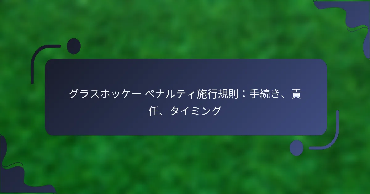 グラスホッケーにおけるペナルティの執行は、試合全体の公平性と明確性を確保するための構造化されたプロセスです。審判は違反を特定し、決定を伝え、紛争を管理する上で不可欠な役割を果たし、選手はこれらの状況における自分の責任を理解しておく必要があります。さらに、ペナルティ執行中の効果的なタイミング管理は、試合の流れと戦略を維持するために重要であり、期間、交代、停止に関するルールを厳守することが求められます。 グラスホッケーにおけるペナルティ執行の手続きは何ですか? グラスホッケーにおけるペナルティの執行は、試合中の公平性と明確性を確保するための構造化されたプロセスです。審判は違反を特定し、決定を伝える上で重要な役割を果たし、選手はこれらの状況における自分の責任を理解する必要があります。 ペナルティを呼び出すためのステップバイステッププロセス ペナルティを呼び出すプロセスは、審判が潜在的な違反を観察することから始まります。ファウルを目撃した場合、審判は手を挙げるかホイッスルを吹いて即座にペナルティを合図しなければなりません。この行動は、選手や観客に状況を知らせます。 次に、審判は違反を犯した選手にペナルティの内容を明確に伝え、違反した具体的なルールを説明します。このコミュニケーションは、すべての参加者間の透明性と理解を維持するために重要です。 ペナルティが呼び出された後、審判は違反の重大性に応じてペナルティの適切な期間を決定します。審判は、その後、試合がスムーズに再開されるようにし、しばしばプレーの再開を合図します。 ペナルティ執行における審判の役割 審判はルールを執行し、試合の整合性を維持する責任があります。彼らの主な職務には、ファウルの特定、ペナルティの評価、すべての選手が規則を遵守することを確保することが含まれます。試合中、彼らは常に警戒を怠らず、公平でなければなりません。 ペナルティを呼び出すことに加えて、審判は各違反を正確に記録する必要があります。この文書は、将来の参照のための記録として機能し、試合後に発生する可能性のある紛争にとって重要です。 潜在的な違反を観察する。 選手や観客に対してペナルティを明確に合図する。 違反を犯した選手にペナルティの内容を伝える。 記録のためにペナルティを文書化する。 ペナルティ中に選手が取るべき行動 ペナルティが呼び出された場合、違反を犯した選手は即座にフィールドを離れ、審判が決定したペナルティを務めなければなりません。この行動は、試合の流れを維持し、ペナルティが公平に執行されることを確保するために重要です。 フィールド上の選手は状況を把握し、それに応じて戦略を調整する必要があります。彼らは、チームメイトが一人少ない状態でプレーする準備をし、新たな試合のダイナミクスに適応しなければなりません。 この時期、チームメイト間のコミュニケーションは不可欠です。選手は、ペナルティを受けた選手の不在を補うために戦略やポジションについて話し合うべきです。 ペナルティの文書化と報告 ペナルティの正確な文書化は、試合の整合性を維持するために不可欠です。審判は、ペナルティの種類、関与した選手、発生した時間などの詳細を記録しなければなりません。この情報は、試合後の分析や潜在的な紛争にとって重要です。 報告は、必要に応じて統括団体やリーグの役員に提出されるべきです。これらの報告は、選手の行動を追跡し、懲戒措置が一貫して公平であることを確保するのに役立ちます。 審判は、選手やコーチから質問された場合に、自分の決定について説明できる準備をしておくべきです。明確で簡潔な報告は、スポーツ内での信頼と理解を促進します。 ペナルティの一般的なシナリオと例 グラスホッケーにおける一般的なペナルティシナリオには、スティック干渉、危険なプレー、妨害などのファウルが含まれます。これらの違反はそれぞれ特定の結果を伴い、しばしば一時的なプレー停止を引き起こします。 例えば、スティック干渉は、選手が相手の動きを妨げるためにスティックを使用する場合に発生し、違反を犯した選手が短時間フィールドを離れることを要求されるペナルティが科されることがあります。危険なプレーは、高いスティックや無謀な行動を含むことがあり、通常はより厳しく罰せられます。