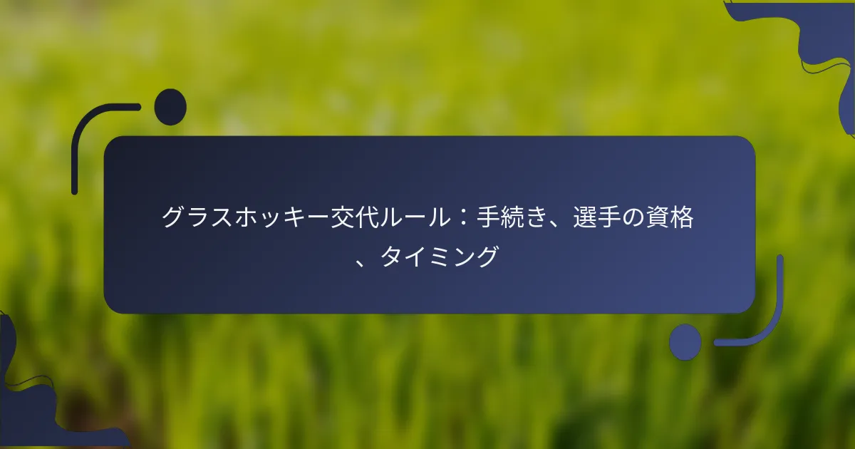 グラスホッケーにおける交代は、公正なプレーを確保し、ゲームの流れを維持するための特定の手続きに従っています。選手はプレーの中断中に交代することができ、チームは統治機関が定めた適格基準に従いながら戦略的にラインアップを調整できます。これらのルールを理解することは、選手やコーチが試合中のチームのダイナミクスを効果的に管理するために重要です。 グラスホッケーにおける交代の手続きは何ですか? グラスホッケーの交代は、公正なプレーを確保し、ゲームの流れを維持するための特定の手続きが含まれています。これらのルールを理解することは、選手やコーチが試合中のチームのダイナミクスを効果的に管理するために不可欠です。 選手交代のステップバイステッププロセス 交代プロセスは、コーチまたは選手が交代を求める合図を出すことから始まります。フィールドを離れる予定の選手は、指定された交代エリアで退出しなければならず、入ってくる選手は、出て行く選手が完全にフィールドを離れるまで待機する必要があります。これにより、スムーズな移行が確保され、混乱を避けることができます。 出て行く選手が退出したら、入ってくる選手はフィールドに入ることができます。交代が遅れずに行われることが重要で、ゲームのペースを維持するために必要です。両選手は、自分のポジションを把握しておく必要があり、不適切な交代によるペナルティを避けるために注意が必要です。 試合中に交代が行えるタイミング 交代は通常、ボールがアウトオブバウンズになったときやゴールが決まった後など、プレーの中断中に行われます。これにより、チームはゲームの流れを大きく乱すことなく選手を交代できます。 ただし、選手が適切な合図と退出プロトコルに従う限り、アクティブなプレー中にも交代が行われることがあります。コーチは、選手のパフォーマンスを最大化し、疲労を最小限に抑えるために、戦略的に交代を計画する必要があります。 交代の合図と呼びかけ 成功する交代には明確なコミュニケーションが不可欠です。コーチは、交代が必要なときに特定の手の合図や口頭の合図を使用することがよくあります。選手は、タイムリーな変更を確保するために、これらの合図を迅速に認識できるように訓練されるべきです。 さらに、審判も交代の合図を出すことがあり、特に選手が負傷している場合や交代が必要な場合に行われます。これらの合図を理解することは、試合中の秩序と効率を維持するのに役立ちます。 中断中の交代手続き 中断中、選手は交代のための構造化された手順に従わなければなりません。出て行く選手は、フィールドを離れる前に審判または公式に通知し、交代が認識されるようにします。これにより、選手の適格性やゲームの状況に関する混乱を防ぎます。 入ってくる選手は、出て行く選手が退出した直後に入る準備をしておかなければなりません。この迅速な移行は、特に試合の重要な瞬間において、チームの勢いと戦略を維持するために重要です。 不適切な交代手続きの結果 適切な交代手続きを守らないと、チームにペナルティが科される可能性があります。これには、相手チームへのフリーヒットが含まれます。一般的なミスには、選手が間違った場所でフィールドに入ったり退出したりすることや、適切な合図なしに行動することが含まれます。 チームは、これらのペナルティを避けるために、選手に交代ルールを遵守する重要性を教育する必要があります。定期的な練習と明確なコミュニケーションが、エラーを軽減し、試合中の遵守を確保するのに役立ちます。 グラスホッケーにおける交代の適格者は誰ですか? グラスホッケーでは、選手は統治機関が定めた特定の基準に基づいて交代の適格者となります。一般的に、ベンチにいる選手は、定められたガイドラインを満たしている限り、フィールドにいる選手と交代することができます。 交代のための選手の適格基準 交代のために適格であるためには、選手はチームに正式に登録されている必要があり、ペナルティを受けていないことが求められます。さらに、選手は適切なユニフォームを着用し、選手の適格性に関する特定のリーグ規則に従う必要があります。 チームは、すべての交代選手がルールを理解し、呼ばれたときにゲームに入る準備ができていることを確認する必要があります。この準備には、ゲームの状況や採用されている戦略を理解することが含まれます。 許可される交代の数に関する制限 グラスホッケーでは、試合中に許可される交代の数は通常限られており、リーグやトーナメントのルールに応じて、1試合あたり5〜7回の交代が一般的です。チームは、選手のスタミナとゲームの勢いを維持するために、戦略的に交代を管理する必要があります。