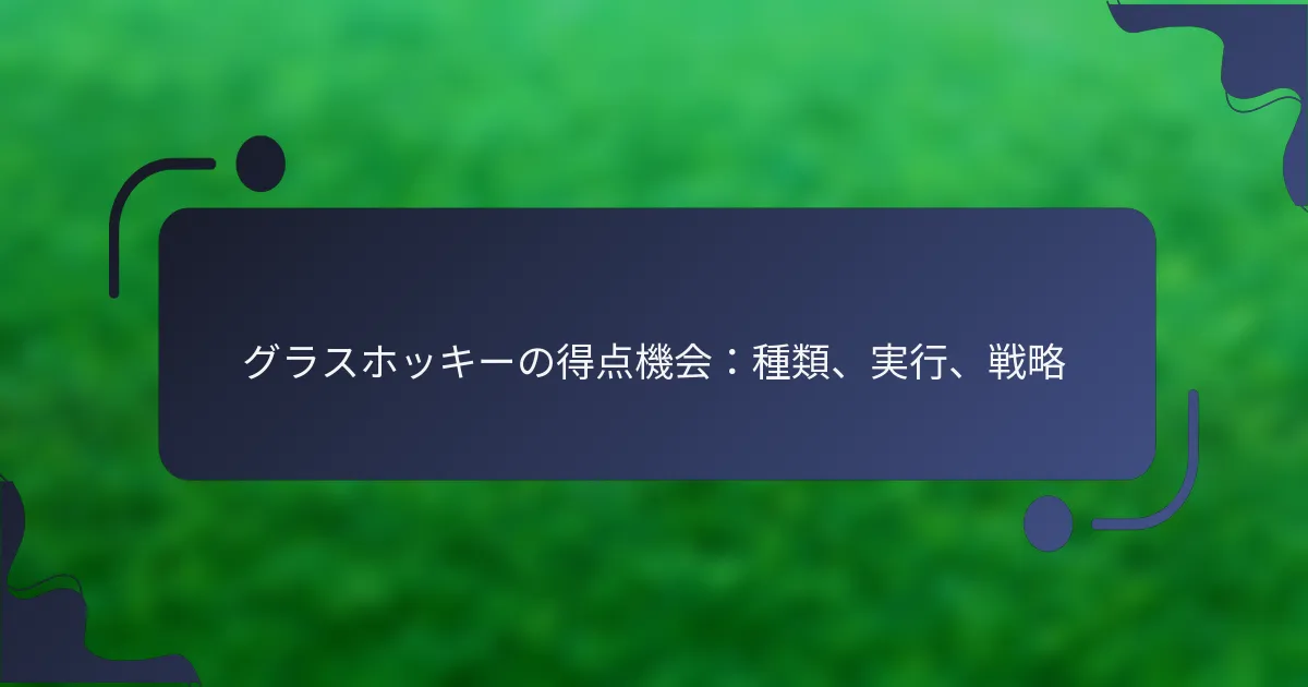 グラスホッケーでは、得点機会が成功のために不可欠であり、さまざまなタイプに分類され、それぞれ特定の実行技術を要求します。これらの技術を習得し、効果的な戦略を採用することで、選手は試合中に得点チャンスを生み出し、活かす能力を高めることができます。 グラスホッケーにおける得点機会の種類は何ですか? グラスホッケーでは、得点機会は複数の主要なタイプに分類され、それぞれ特定の実行技術を必要とします。これらのタイプを理解することで、選手は試合中の得点チャンスを最大限に活用できます。 フィールドゴールとその実行 フィールドゴールは、オープンプレー中にボールがシューティングサークル内から相手のゴールに打ち込まれることで得点されます。フィールドゴールを成功させるためには、選手はポジショニング、タイミング、ショットの精度に集中する必要があります。 ポジショニング:選手はゴールに対して良い角度を維持し、ディフェンダーに注意を払うべきです。 タイミング:特にゴールキーパーがポジションを外しているときに、タイミングの良いショットは得点チャンスを高めます。 ショットの精度:ゴールの隅を狙うことで、ゴールキーパーがセーブしにくくなります。 フリックやドライブなど、さまざまなシューティング技術を練習することで、選手はフィールドゴールを効果的に得点する能力を高めることができます。 ペナルティコーナーと戦略 ペナルティコーナーは、シューティングサークル内での防御ファウルに対して与えられるセットプレーです。これは得点のための構造化された機会を提供し、しばしば複数の選手が協力して行います。 実行:ボールはコーナースポットに置かれ、選手がそれをチームメイトに押し出し、チームメイトがシュートを打ちます。 バリエーション:チームは、フェイクショットやパスなど、ディフェンスを混乱させるために異なるフォーメーションやプレーを使用できます。 リバウンド:選手はゴールキーパーやディフェンダーからのリバウンドを活かす準備をしておくべきです。 効果的なコミュニケーションと練習は、ペナルティコーナーでのチームの成功率を大幅に向上させることができます。 ペナルティストロークと使用条件 ペナルティストロークは、明確な得点機会を妨げる重大なファウルに対して与えられます。これはシューティングとゴールキーパーの間の一対一の状況を含みます。 条件:ペナルティストロークは、意図的な妨害やシューティングサークル内でのファウルなどのファウルに対して通常与えられます。 実行:シュートを打つ選手は冷静さと集中力を保ち、直接シュートを打つか、欺瞞的な動きを試みるかを選ぶ必要があります。 練習:ペナルティストロークの定期的な練習は、選手が自信と技術を向上させるのに役立ちます。 ペナルティストロークにつながる条件を理解することで、選手は不必要なファウルを避け、得点チャンスを活かすことができます。 ディフレクションと効果的なヒント ディフレクションは、選手がボールをリダイレクトすることで発生し、しばしば予期しない得点機会を生み出します。この技術は、ゴールキーパーを混乱させるのに特に効果的です。 ポジショニング:選手はディフレクションのチャンスを最大化するためにゴールの近くに位置するべきです。 認識:ボールの軌道を予測することは、成功するディフレクションにとって重要です。