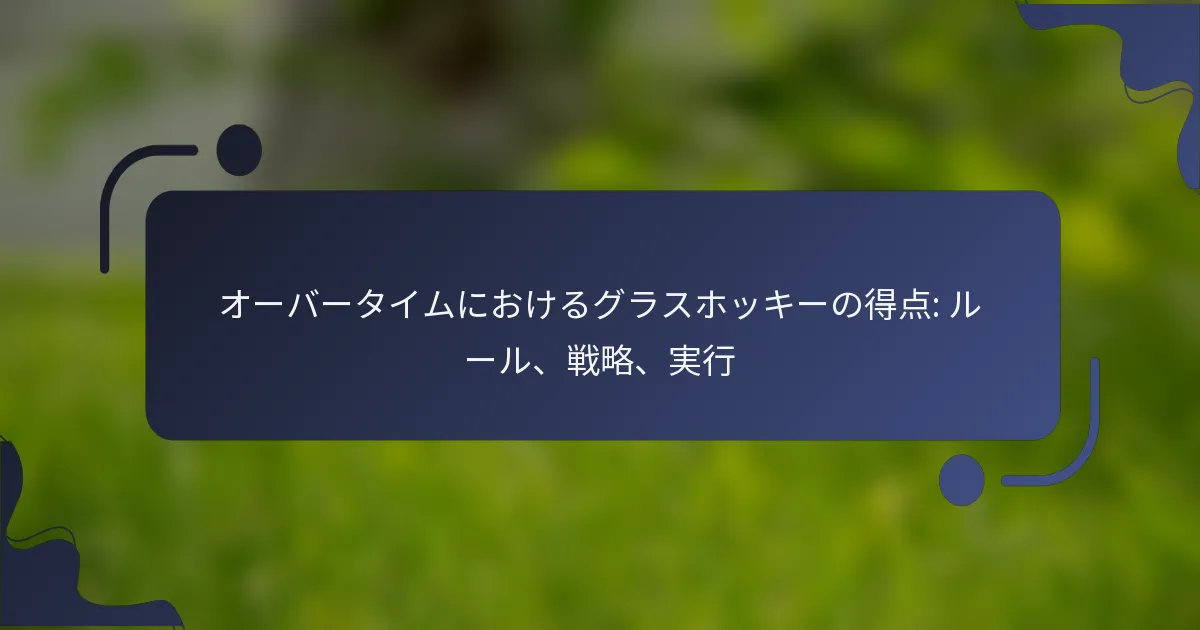 グラスホッケーにおいて、オーバータイムの得点ルールは、試合が引き分けで終了した際に勝者を決定するために重要です。このフェーズでは、短い時間と特定の選手数の調整が行われ、独自の得点規則が適用されます。成功の可能性を最大化するために、チームは効果的な戦略を採用し、コミュニケーション、迅速な意思決定、プレッシャー下での適応力を強調する必要があります。 グラスホッケーにおけるオーバータイムの得点に関する公式ルールは何ですか? グラスホッケーにおけるオーバータイムの得点ルールは、試合が規定時間の終了時に引き分けの場合に勝者を決定するために設計されています。オーバータイムは通常、短い時間と特定の選手数の調整が行われ、標準のプレーとは異なる独自の得点規則が適用されます。 オーバータイムの期間 グラスホッケーのオーバータイムの期間は通常10分に設定されていますが、これはトーナメントやリーグの規則によって異なる場合があります。初回のオーバータイムの後も試合が引き分けのままであれば、勝者が決まるまで追加の期間が行われることがあります。各追加のオーバータイム期間は通常、約5分と短くなります。 これらのオーバータイム期間中は、怪我やその他の重大な中断による停止を除いて、時計は連続して進みます。この高速な形式は、チームが迅速に得点する必要性を高めます。 フィールド上の選手数 オーバータイムでは、フィールド上の選手数は通常のプレーと比較して減少します。通常、各チームは7人の選手をフィールドに出し、その内訳はフィールドプレーヤー6人とゴールキーパー1人です。この減少により、フィールド上により多くのオープンスペースが生まれ、攻撃的な戦略が促進され、得点機会が増加します。 選手数の調整は、オーバータイムの興奮を高め、より速いプレーとダイナミックな得点チャンスを可能にすることを目的としています。チームは、少ない選手数に対応するために戦略を適応させつつ、防御の整合性を維持する必要があります。 通常のプレーとは異なる特定の規則 グラスホッケーのオーバータイムでは、通常の試合ルールとは異なる特定の規則が導入されます。特に注目すべき違いは「ゴールデンゴール」ルールで、オーバータイム中に最初に得点したチームが試合に勝利します。このルールは賭けを高め、攻撃的なプレーを促します。 さらに、チームはオーバータイム中により自由に交代を行うことが許可される場合があり、これにより選手のスタミナとパフォーマンスを維持するのに役立ちます。コーチはしばしばこれを利用し、選手を戦略的にローテーションさせてチームをフレッシュに保ちます。 オーバータイム中の得点基準 オーバータイム中の得点は、通常のプレーと同じ基準に従い、ボールがポスト間のゴールラインを越えた場合に得点が与えられます。しかし、オーバータイムの緊急性のため、チームは得点機会を生み出すためにより攻撃的な戦術を採用することがよくあります。 選手は自分の位置と残り時間を常に意識することが重要で、タイミングの良いシュートが迅速な勝利につながる可能性があります。チームは得点機会を最大化し、防御の隙を最小限に抑えることに集中するべきです。 オーバータイム中のペナルティとファウル オーバータイム中のペナルティとファウルは通常のプレーと同様に適用されますが、短い時間枠のため、その影響はより重要になる可能性があります。ペナルティコーナーやストロークが与えられたチームは、試合を決定づける得点の重要なアドバンテージを得ることができます。 選手はペナルティにつながるファウルを避けるために注意を払う必要があります。これにより勢いが変わり、相手チームに貴重な得点機会を提供する可能性があります。オーバータイムで勝利を確保しようとするチームにとって、規律を維持することは不可欠です。 チームがオーバータイムで得点を最大化するために採用できる戦略は何ですか? チームはグラスホッケーのオーバータイム中に得点のチャンスを高めるためにさまざまな戦略を採用できます。これらの戦略は、効果的なフォーメーション、正確な選手の配置、高圧プレー、時間管理、チームメイト間の強力なコミュニケーションに焦点を当てています。 オーバータイムプレーのための効果的なフォーメーション 適切なフォーメーションを選ぶことは、オーバータイムでの得点機会を最大化するために重要です。一般的なフォーメーションには、2-2-1や3-1のセットアップが含まれ、攻撃のプレッシャーと防御のカバーを両立させます。2-2-1フォーメーションはバランスの取れたアプローチを提供し、攻撃と防御の間の迅速な移行を可能にします。 チームはフォーメーションを選択する際に、自分たちの強みと相手の弱点を考慮すべきです。たとえば、チームに強力なフォワードがいる場合、より攻撃的な3-1フォーメーショ