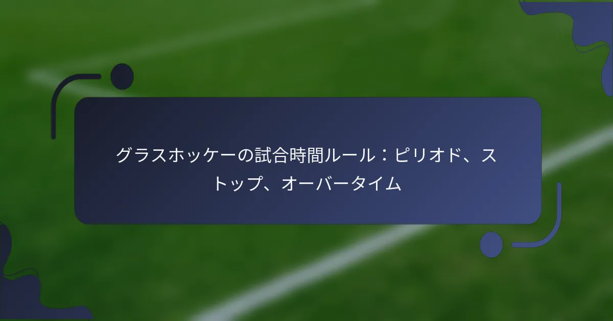 グラスホッケーの試合は、選手と観客が理解するために重要な設定された時間と休憩を持つ明確な期間に分かれています。プレーの中断はさまざまな理由で発生し、試合の全体的な時間と流れに影響を与える可能性があります。規定時間の終了時にスコアが同点の場合、オーバータイムのルールが適用され、勝者を決定するために追加の期間が設けられることがよくあります。 グラスホッケーの試合の構造はどのようになっていますか? グラスホッケーの試合は、特定の時間と休憩を持つ明確な期間に構成されています。試合の形式、期間の数、そして中断の管理方法を理解することは、選手と観客の両方にとって不可欠です。 標準的な試合の期間の数 標準的なグラスホッケーの試合は、4つの期間で構成されています。この形式は、戦略的な休憩を取りながら、速いペースで魅力的な試合を維持するために設計されています。各期間は、チームが戦術を実行し、試合の流れに適応するために重要です。 一部のリーグやトーナメントでは、期間が少ない短い試合などのバリエーションが存在する場合があります。しかし、4期間の構造は広く認識され、ほとんどの競技設定で使用されています。 各期間の長さ グラスホッケーの試合の各期間は通常15分間続きます。この時間は、チームがスキルを発揮しながら試合をダイナミックに保つことを可能にします。プレー中は時計が連続して動き、ファウルや怪我による中断を除きます。 選手は、ペースが激しいため、これらの15分間のセグメントを通じてエネルギーを効果的に管理することが重要です。チームは、相手にプレッシャーをかけながらスタミナを節約する方法を戦略的に考えることがよくあります。 期間間の休憩 4つの期間の間には、短い休憩があります。これらの休憩は通常約2分間で、チームが再編成し、戦術的な調整を行う機会を提供します。コーチはこの時間を利用して戦略を伝え、選手を鼓舞します。 この休憩中、選手は水分補給をし、次の期間が始まる前に短時間回復することができます。しかし、短い時間のため、準備は効率的に行う必要があります。 ハーフタイムの長さ ハーフタイムの休憩は第2期間の後に発生し、約5分間続きます。これはグラスホッケーの試合で最も長い休憩で、選手が休息を取り、より詳細なコーチングを受けることができます。チームはこの時間を利用してパフォーマンスを再評価し、試合の後半に向けて必要な調整を行います。 ハーフタイムは、選手の士気を維持し、チームが残りの期間で効果的に競争できるようにするために重要です。 試合時計の管理 グラスホッケーにおける試合時計の管理は重要で、プレー中はゲーム時計が連続して動きます。怪我、ファウル、またはその他の中断のための中断が発生すると、時計が止まり、チームは貴重なプレー時間を失うことなく戦略を考えることができます。 時計が止まるタイミングを理解することは、特に接戦の試合ではチームのアプローチに影響を与える可能性があります。選手は残り時間を常に意識し、特に期間や試合の最後の数分で成功の可能性を最大化する必要があります。 グラスホッケーの試合中のプレーの中断とは何ですか? グラスホッケーの試合中のプレーの中断は、怪我、ペナルティ、その他の中断など、さまざまな理由で発生します。これらの中断は、試合の全体的な時間とゲームの流れに大きな影響を与える可能性があります。 中断の種類(怪我、ペナルティなど) 怪我:選手が怪我をした場合、プレーが中断され、医療スタッフが対応します。 ペナルティ:ファウルが発生した場合、中断が発生し、ペナルティショットや選手の退場が行われます。 ボールがプレー外:ボールがアウトオブバウンズになるとゲームが停止し、サイドラインまたはベースラインから再開されます。 タイムアウト:チームは戦略的な議論や選手の休息のためにタイムアウトを取ることができ、通常は短い時間です。
