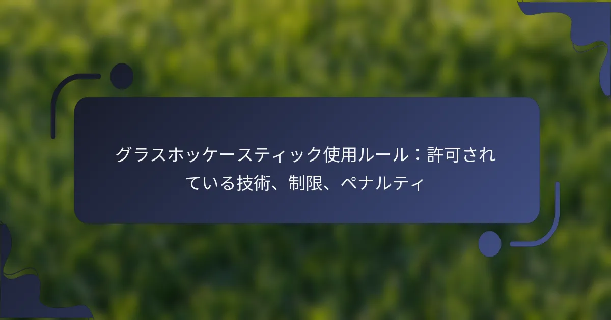グラスホッケーのスティック使用には、選手がフィールドでの公正なプレーと安全を確保するために従うべき特定の技術と制限があります。これらのルールに精通していることは、ペナルティを避け、全体的なゲームプレイを向上させるために不可欠です。ガイドラインを遵守することは、競争心を促進するだけでなく、すべての参加者の健康を守ることにもつながります。 グラスホッケースティックの使用に許可されている技術は何ですか? グラスホッケースティックの使用には、選手がゲームプレイ中に従うべきさまざまな技術が含まれます。これらの技術を理解することは、効果的なプレーとルールの遵守にとって重要です。 ゲームプレイで許可されているスティックハンドリング技術 グラスホッケーにおけるスティックハンドリングは、ボールをコントロールしながらボールを保持することを含みます。選手は、ボールを操るためにスティックの平らな面を使用することが許可されており、ボールを自分の手の届く範囲内に保つことが求められます。素早い手首の動きは、方向転換を迅速に行うのに役立ち、敏捷性を高めます。 選手は、ボールコントロールのためにスティックの丸い側を使用することを避けるべきです。これはファウルと見なされます。スティックハンドリングのドリルを練習することで、協調性が向上し、プレッシャーの下でボールを保持する能力が高まります。 試合中に許可されているパス技術 効果的なパスは、グラスホッケーにおけるチームプレーにとって重要です。選手は、プッシュパスまたはスラップパスを使用してボールをパスすることができ、どちらもスティックの平らな面で実行する必要があります。プッシュパスは通常、短距離用に使用され、スラップパスは長距離に適しています。 パス中にボールが過度に持ち上げられないようにすることが重要です。これによりペナルティが発生する可能性があります。選手は、ボールを地面に保つことを目指し、コントロールを維持し、ファウルのリスクを最小限に抑えるべきです。 規則に準拠したシューティング技術 グラスホッケーでのシューティングは、規則に準拠するためにスティックの平らな面を使用して行う必要があります。選手は、フリックショットやドライブショットなどの技術を利用でき、どちらも正しい体の位置で実行することで精度とパワーを確保します。 シュートする際、選手はボールを高く持ち上げることを避けるべきです。特定の高さを超えるシュートはペナルティの原因となる可能性があります。シューティング技術を練習することで、得点機会が増え、全体的なゲームプレイが向上します。 ドリブルのルールとベストプラクティス ドリブルはグラスホッケーにおける重要なスキルであり、選手がボールを保持しながらディフェンダーをかわすことを可能にします。選手は、スティックの平らな面を使用してドリブルし、ボールを足元に近づけてコントロールを向上させるべきです。効果的なドリブルには、素早く短いタップが推奨されます。 ドリブル中はフィールドと相手に対する意識を維持することが重要です。選手は、ディフェンダーを効果的にかわすために速度と方向を変える練習をするべきです。ドリブル中にボールを過度に持ち上げることを避けることも、ファウルを防ぐために重要です。 スティックプレイにおける体の位置取りの使用 体の位置取りは、効果的なスティックプレイにおいて重要な役割を果たします。選手は、膝を曲げて低い姿勢を取るべきで、これによりスティックを使用する際のバランスとコントロールが向上します。適切な位置取りは、フィールド上での迅速な反応と優れた機動性を可能にします。 さらに、選手はボールと相手の間に体を位置させてボールの保持を守るべきです。この技術は、コントロールを維持するだけでなく、パスやシュートの機会を生み出すのにも役立ちます。体の位置取りを定期的に練習することで、試合中のパフォーマンスが向上します。 グラスホッケースティック使用に関する制限は何ですか? グラスホッケーには、公正なプレーと選手の安全を確保するためにスティック使用に関する特定のルールがあります。これらの制限を理解することは、選手がペナルティを避け、ゲームの基準を維持するために重要です。 禁止されている技術と行動 グラスホッケーでは、ゲームの整合性を維持するために特定の技術と行動が厳しく禁止されています。選手は、他者を危険にさらす可能性のある方法でスティックを使用することを避けるべきです。たとえば、肩の高さを超えて振り回したり、相手をつまずかせるために使用したりすることです。 一般的な禁止行動には、スティックのエッジでボールを打つこと、逆スティックを使用してボールをプレイすること、地面にあるボールに危険な方法で接触することが含まれます。これらの行動はペナルティを引