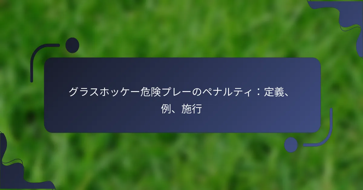 グラスホッケーにおける危険なプレーは、選手の安全を脅かす行為を含み、公正な競技を維持するためにペナルティが科されることがよくあります。例としては、高いスティック、無謀なタックル、ボディチェックなどがあり、これらは深刻な怪我につながる可能性があります。審判は選手を保護し、ゲームの整合性を守るためにこれらのルールを施行します。 グラスホッケーにおける危険なプレーとは何か? グラスホッケーにおける危険なプレーは、選手に怪我のリスクをもたらす行為を指し、しばしばペナルティが科されます。これは、無謀な行動や相手を傷つける可能性のある行為を含み、選手の安全を確保するために審判によって施行されます。 公式ルールに基づく危険なプレーの定義 グラスホッケーの公式ルールによれば、危険なプレーは他の選手に怪我を引き起こす可能性のある行為として定義されています。これには、スティックを不適切に使用すること、無謀な方法で相手に接触すること、またはフィールド上の他の選手の安全を脅かす行動が含まれます。 審判は、問題となる行為の意図と結果を評価する役割を担っています。選手の行動が無謀または不注意と見なされる場合、怪我が発生していなくても危険なプレーとしてペナルティが科されることがあります。 危険なプレーとして分類される一般的な行為 グラスホッケーにおいて一般的に危険なプレーとして分類される特定の行為はいくつかあります。これには以下が含まれます: スティックを肩の高さ以上に上げる高いスティック。 地面に横たわりながらボールをプレーすること、これにより衝突が発生する可能性があります。 相手をつまずかせたり押したりするためにスティックを使用すること。 意図的に相手をスティックで叩くこと。 これらの行為は審判によって厳しく監視されており、選手はフィールド上の安全を維持するために避けるように勧められています。 危険なプレーの分類に影響を与える文脈的要因 プレーが危険と見なされるかどうかに影響を与える文脈的要因はいくつかあります。ゲームのスピード、選手の位置、試合中の全体的な状況がすべて関与します。例えば、高いスティックの事例は、速攻中に発生した場合と遅いプレー中に発生した場合で異なる見方をされることがあります。 さらに、関与する選手の経験レベルも分類に影響を与える可能性があります。初心者の選手は、熟練したアスリートと同じ制御を持っていない場合があり、これが意図しない危険なプレーにつながることがあります。 危険なプレーと他のペナルティの違い 危険なプレーは、妨害やスポーツマンシップに反する行為などの他のペナルティとは異なります。危険なプレーは特に怪我のリスクがある行為に焦点を当てているのに対し、他のペナルティは必ずしも選手を危険にさらさないルール違反を含むことがあります。 例えば、妨害は物理的接触なしに相手の動きを妨げることを含み、スポーツマンシップに反する行為は不敬または不公平な行動に関連しています。これらの違いを理解することで、選手はルールをより効果的に把握できます。 危険なプレーの定義の歴史的進化 グラスホッケーにおける危険なプレーの定義は、選手の安全基準やゲームのダイナミクスの変化を反映して時間とともに進化してきました。初期のルールはそれほど厳格ではなく、しばしば怪我を引き起こすより攻撃的なプレーが許可されていました。 スポーツが進化するにつれて、統括団体は選手を保護するためにより厳しい規制を導入しました。この進化により、危険なプレーのペナルティの明確な定義と一貫した施行が実現し、ゲームにおける安全の重要性が強調されました。 グラスホッケーにおける危険なプレーの例は何か? グラスホッケーにおける危険なプレーは、選手に怪我のリスクをもたらす行為を指し、しばしばペナルティが科されます。一般的な例としては、高いスティック、無謀なタックル、ボディチェックがあり、これらは試合中に深刻な結果をもたらす可能性があります。 危険なプレーを示す実際のシナリオ