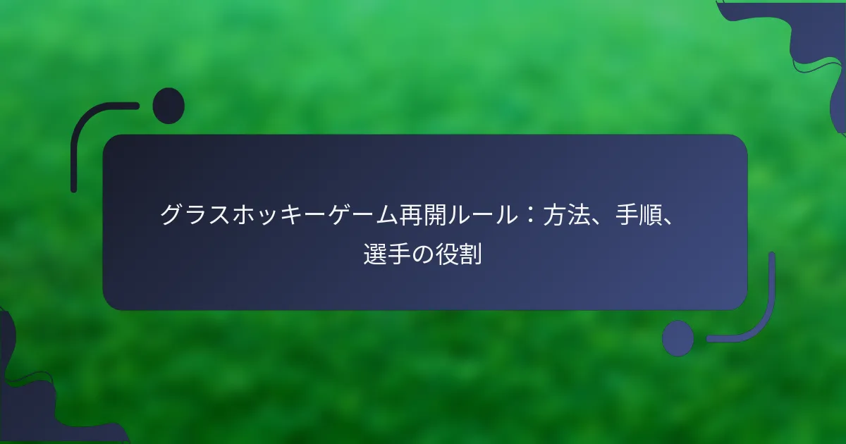 グラスホッケーの試合は、フリーヒット、ペナルティコーナー、ペナルティストローク、セルフパスなど、さまざまな方法で再開できます。各方法の具体的な状況と手順を理解することは、選手や審判が中断後の公正なプレーと試合の流れを維持するために不可欠です。再開時の各選手の役割は重要であり、フォワード、ディフェンダー、ゴールキーパーは、チームの戦略と効果に影響を与える異なる責任を持っています。 グラスホッケーの試合を再開する方法は何ですか? グラスホッケーの試合は、フリーヒット、ペナルティコーナー、ペナルティストローク、セルフパスなど、さまざまな方法で再開できます。各方法の具体的な状況と手順を理解することは、選手や審判が公正なプレーとルールの遵守を確保するために重要です。 フリーヒット:状況と実行 フリーヒットは、妨害や偶発的なファウルなどの軽微な違反に対して与えられます。フリーヒットを与えられたチームは、違反が発生した場所からフリーヒットを行う必要があり、試合を迅速に再開できるようにします。 フリーヒットを実行するには、選手はボールが静止していることを確認してから接触する必要があります。他の選手は、ボールがプレーされるまで、ボールから少なくとも5メートル離れている必要があります。この距離は、干渉を防ぎ、公正な再開を確保するために重要です。 ペナルティコーナー:ルールと手順 ペナルティコーナーは、シューティングサークル内での特定のファウル、たとえばディフェンダーが故意に体でボールを止めた場合に与えられます。この再開は、攻撃チームにセットポジションから得点する機会を提供します。 ペナルティコーナーの際、ボールはバックラインに置かれ、攻撃チームにはボールをプレーに入れるための指定された選手がいます。ディフェンダーは、ボールがプレーされるまでゴールラインの後ろに留まる必要があり、ボールが動き出すまでサークルに入ることはできません。 ペナルティストローク:適用のタイミングと方法 ペナルティストロークは、明確な得点機会を奪う重大なファウルに対して与えられます。たとえば、ディフェンダーがサークル内で攻撃者を故意にファウルした場合です。ストロークは、通常ゴールラインから7メートルの指定された場所から行われます。 ペナルティストロークを実行するには、選手はゴールに直接シュートし、ゴールキーパーはボールがプレーされるまでゴールラインに留まる必要があります。この方法は、攻撃選手が得点の直接的なチャンスを持つため、スキルと精度を強調します。 セルフパス:定義と使用法 セルフパスは、選手がボールを自分にパスすることでゲームを再開できるルールです。このルールは、試合のペースを向上させ、継続的なプレーを促進します。 選手はフリーヒットや特定の再開時にセルフパスを利用できますが、ボールを前方に移動させる必要があります。相手選手は、このタイプの再開時に干渉を避けるために必要な距離を尊重しなければなりません。 怪我後のゲーム再開:プロトコル 選手が怪我をした場合、通常試合は停止され、審判が状況を評価します。怪我が深刻な場合、医療支援が到着するまで試合が中断され、選手が安全にフィールドから退去されることがあります。 怪我をした選手が手当てを受けた後、試合は中断前にボールを保持していたチームにフリーヒットが与えられ、再開されます。これにより、試合が公正に再開され、プレーの流れが維持されます。 再開ルールを実施する手順は何ですか? グラスホッケーの再開ルールは、中断後の試合の流れを維持するために不可欠です。これらの手順は、プレーがどのように再開されるか、いつ再開されるかを規定し、すべての選手に公平性と明確さを確保します。 再開時の選手の配置 再開時の選手の適切な配置は、秩序ある効果的なプレーの再開にとって重要です。各選手は、自分の役割を理解し、混乱を避け、ゲームの整合性を維持する必要があります。 フリーヒットの際、選手はボールから少なくとも5メートル離れている必要があります。 ペナルティコーナーでは、攻撃者はシューティングサークル内に位置し、ディフェンダーはボールがプレーされるまで外に留まる必要があります。 16ヤードヒットの際、選手はスペースを作り、ヒットを行う選手のためのオプションを提供するために広がる必要があります。