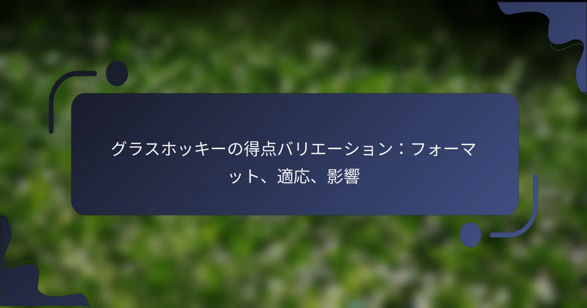 グラスホッケーの得点形式には、伝統的な方法と現代の適応が含まれ、ゲームプレイや戦略に影響を与えています。これらの形式を理解することは、選手、コーチ、ファンにとって重要であり、攻撃的および防御的アプローチに影響を与え、最終的にはチームのパフォーマンスや競争力に影響を及ぼします。 グラスホッケーにおける主要な得点形式は何ですか? グラスホッケーにおける主要な得点形式には、数十年にわたって使用されてきた伝統的な方法と、ゲームプレイや戦略の変化を反映した現代の適応が含まれます。これらの形式を理解することは、選手、コーチ、ファンにとって不可欠であり、ゲームの進行や得点に大きな影響を与えます。 グラスホッケーで使用される伝統的な得点方法 グラスホッケーにおける伝統的な得点方法は、通常、ボールがポストの間のゴールラインを越えたときにゴールが認められます。ゴールは通常1ポイントの価値があり、試合は規定時間終了時に最も高い得点を持つチームが勝利します。 多くの場合、ゴールは指定されたエリア内からのみ得点でき、これをシューティングサークルと呼ぶことがよくあります。このエリアは得点の機会を制限し、選手が射程内に入るために動き回ることを促します。 相手のネットにボールを打ち込むことで得点します。 シューティングサークル内の選手のみが得点できます。 試合は通常、2つのハーフで行われ、合計得点が勝者を決定します。 得点形式の現代的な適応 グラスホッケーにおける得点形式の現代的な適応は、ゲームのペースと興奮を高めるために登場しました。これらの適応には、異なるタイプのゴールに対して与えられるポイント数の変動や、試合中の特定の成果に対するボーナスポイントの導入が含まれることがあります。 いくつかのリーグでは、チームが限られた時間内に数的優位を持つパワープレイのような概念を試みており、得点の機会を増やすことができます。さらに、インスタントリプレイのための技術の使用は、得点の決定に影響を与え、ゴールの検証の正確性を確保します。 シューティングサークルの外から得点した場合のボーナスポイント。 得点における一時的な優位を可能にするパワープレイ。 ゴール確認のためのビデオ技術の使用。 ユースリーグにおける得点システム ユースリーグでは、若い選手を受け入れ、参加を促進するために簡略化された得点システムを実施することがよくあります。これらのシステムには、得点や試合の時間に関する修正されたルールが含まれ、すべての参加者にとってポジティブな体験を確保します。 多くのユースリーグでは、勝利だけでなく、スキルの発展やチームワークにも焦点を当てています。そのため、得点はあまり強調されず、すべての選手に得点し、ゲームに貢献する平等な機会が与えられます。 リーグタイプ 得点形式 試合時間 初心者リーグ ゴールごとに1ポイント、制限なし 20-30分 中級リーグ