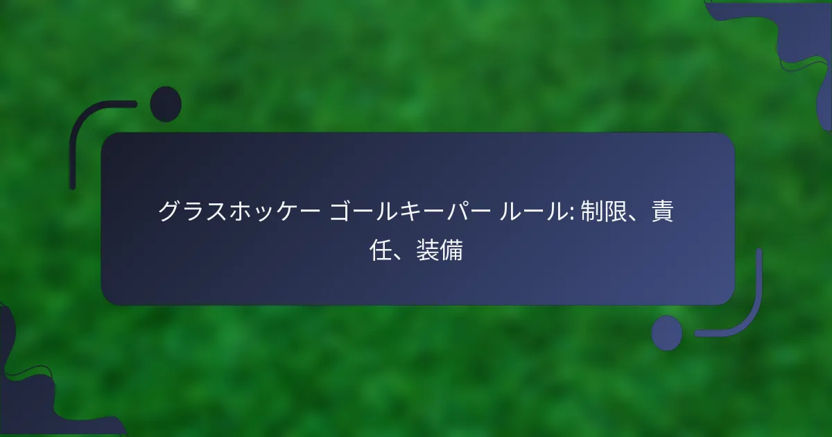 グラスホッケーのゴールキーパーは、ゲームにおいて重要な役割を果たし、公正なプレーと選手の安全を確保するための特定の制限に直面しています。彼らの責任は、ゴールを守るだけでなく、ディフェンスを組織し、プレーを開始することにも及びます。効果的にパフォーマンスを発揮するためには、厳格な規則に従った専門的な装備を使用する必要があります。これには、保護具や適切なスティックが含まれます。 グラスホッケーのゴールキーパーに対する制限は何ですか? グラスホッケーのゴールキーパーは、ゲームプレイ中の行動を規制する特定の制限に直面しています。これらのルールは、公正なプレーを維持し、フィールド上のすべての参加者の安全を確保するために設計されています。 ゲームプレイ中の禁止行為 ゴールキーパーは、ファウルを防ぎ、ゲームの整合性を維持するために特定の行為を避けなければなりません。一般的な禁止行為には、故意にボールを蹴ること、スティックを使って相手をつまずかせること、または指定されたエリア外でボールを扱うことが含まれます。 さらに、ゴールキーパーはボールを持っていない選手の動きを妨げることができません。これには、彼らの進行を妨げたり、不公平な方法で相手を阻止したりすることが含まれます。 ゴールキーパーが入れないフィールドエリア ゴールキーパーはフィールド上の特定のゾーンに制限されています。彼らはシューティングサークルと指定されたゴールキーパーエリア内でのみ活動することができます。これらのエリアの外に入ると、ペナルティが科される可能性があります。 さらに、ゴールキーパーはボールがプレイ中のときはゴールラインの後ろに留まらなければなりません。これは、彼らがゲームの流れを妨げないようにするためです。 選手との身体接触に関するルール ゴールキーパーに対する身体接触のルールは厳格です。彼らはボールが近くにあるときのみ、対戦相手と接触することが許可されています。攻撃的または無謀な行動はファウルにつながる可能性があります。 ゴールキーパーは、選手を押したり押しのけたりするために自分の体を使うことを避けるべきです。これは重大なペナルティにつながる可能性があります。ルールを遵守するためには、公正な距離を保ち、必要なときのみ関与することが重要です。 装備使用の制限 ゴールキーパーは、自分自身を保護し、パフォーマンスを向上させるために特定の装備を使用することが許可されています。しかし、使用できるものには制限があります。たとえば、ヘルメット、レッグガード、チェストプロテクターを着用しなければなりませんが、追加のパディングや保護具の使用は規則に従わなければなりません。 装備は他の選手に危険を及ぼしてはなりません。たとえば、装備の鋭利なエッジや突起部分は怪我を引き起こす可能性があり、プレイ中は許可されていません。 ルール違反の結果 ゴールキーパーのルールに違反すると、相手チームにフリーヒットやペナルティコーナーが与えられるなど、重大な結果を招く可能性があります。深刻な場合、ゴールキーパーはイエローカードまたはレッドカードを受け、ゲームから一時的または永久に除外されることがあります。 繰り返しの違反は、罰金や出場停止を含む規制機関からの懲戒処分につながる可能性があります。ゴールキーパーは、ペナルティを避け、公正なゲームを確保するために、これらのルールを理解し、遵守することが重要です。 グラスホッケーのゴールキーパーの責任は何ですか? グラスホッケーのゴールキーパーは、ゴールを守り、ディフェンスを組織し、プレーを開始するという重要な責任を負っています。彼らの役割は、ゴールを防ぎ、ディフェンシブおよびオフェンシブな状況でチームをサポートする上で重要です。 ゴールキーパーのためのディフェンシブ戦略 ゴールキーパーは、効果的にゴールを守るためにさまざまなディフェンシブ戦略を採用しなければなりません。主要な戦略には、相手の動きを予測すること、重心を低く保つこと、そして迅速に反応するためにバランスを保つことが含まれます。 ゴールの角度をカバーするように自分の位置を調整する。 ボールの動きと選手の位置に注意を払う。 体を使って効果的にシュートをブロックする。