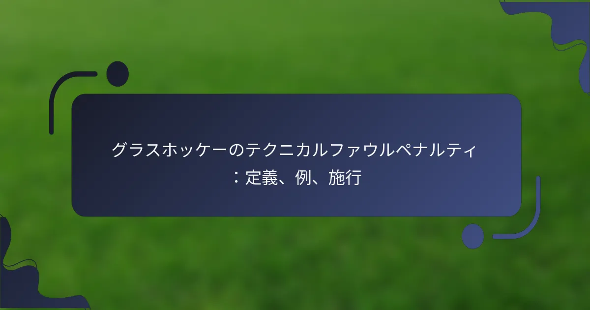 グラスホッケーにおけるテクニカルファウルは、身体的接触やスポーツマンシップに反する行動を伴わないルール違反として定義され、手続き上の違反に関連することが多いです。このようなファウルはゲームの流れを妨げる可能性があり、通常は相手チームにフリーヒットが与えられます。これらのファウルの施行は、フェアプレーを損なう可能性のある違反に対処しつつ、ゲームの精神を維持することを目的とした構造化されたプロセスに従います。 グラスホッケーにおけるテクニカルファウルとは何ですか? グラスホッケーにおけるテクニカルファウルは、身体的接触やスポーツマンシップに反する行動を伴わないゲームのルール違反を指します。これらのファウルは通常、手続き上の違反に関連し、ゲームの流れに影響を与えるペナルティをもたらすことがあります。 テクニカルファウルの定義 テクニカルファウルは、直接的な選手間の接触なしにグラスホッケーの確立されたルールを侵害する違反として定義されます。このようなファウルはゲームを妨げることが多いですが、必ずしも攻撃的またはスポーツマンシップに反する行動を伴うわけではありません。通常、選手のポジショニング、用具、またはゲームの手続きに関連する違反に対して呼ばれます。 例としては、ペナルティコーナー中に適切なフォーメーションを守らなかったり、選手の交代を不適切に行ったりすることが含まれます。これらのファウルは通常、相手チームにフリーヒットが与えられ、ゲームのコントロールを取り戻す機会を与えます。 テクニカルファウルの種類 セットプレー中の不適切なフォーメーション 違法なスティックの使用などの用具違反 交代ルールの遵守失敗 ゲームの遅延ペナルティ 審判への過度な質問などの非公認の選手行動 各種類のテクニカルファウルは、違反の重大性や文脈に応じて異なる結果をもたらす可能性があります。これらの種類を理解することで、選手はペナルティを避け、ゲームの流れを維持することができます。 テクニカルファウルと他のファウルの違い テクニカルファウルは、通常、身体的接触や攻撃的行動を伴うパーソナルファウルなどの他のファウルとは異なります。パーソナルファウルは通常、より重大で、ゲームからの出場停止や退場をもたらす可能性があります。それに対して、テクニカルファウルは一般的にそれほど重大ではなく、選手の行動よりもルールの遵守に焦点を当てています。 例えば、選手が危険なタックルを行った場合、パーソナルファウルが与えられることがありますが、正しいユニフォームを着用していない場合にはテクニカルファウルが呼ばれることがあります。この区別は、選手やコーチが理解することが重要で、試合中の戦略や規律に影響を与えます。 テクニカルファウルを規定するルール テクニカルファウルの施行は、特定の違反とそれに対応するペナルティを概説したグラスホッケーの公式ルールによって規定されています。通常、テクニカルファウルが呼ばれると、相手チームはファウルの発生地点でフリーヒットが与えられ、重大な中断なしにプレーを再開することができます。 審判はファウルの重大性を判断する裁量を持ち、違反の頻度に基づいて警告を発したり、ペナルティにエスカレートさせたりすることができます。これらのルールに精通することは、選手がゲームを効果的に進め、不要なペナルティを避けるために不可欠です。 テクニカルファウルの一般的な別名 グラスホッケーにおけるテクニカルファウルは、地域や統括団体によって異なるさまざまな別名で呼ばれることがあります。一般的な用語には「行政ファウル」、「手続きファウル」、および「非接触ファウル」が含まれます。これらの用語を理解することで、選手やコーチは試合やトレーニングセッション中により効果的にコミュニケーションを取ることができます。 正しい用語を使用することは、審判や公式との議論を助け、潜在的な違反に対処する際の明確さを確保します。これらの別名に精通することで、ゲームのルールの全体的な理解が深まり、より良いスポーツマンシップが促進されます。 グラスホッケーにおけるテクニカルファウルの例は何ですか? グラスホッケーにおけるテクニカルファウルは、ゲームの流れを妨げる違反を指しますが、身体的接触や攻撃的行動を伴うものではありません。これらのファウルは選手やチームによって犯されることがあり、通常は相手チームにフリーヒットが与えられます。 テクニカルファウルにつながる一般的なシナリオ