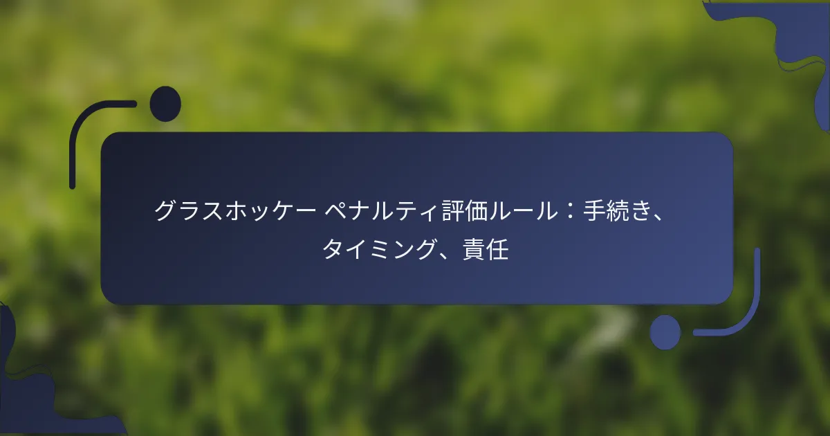 グラスホッケーにおけるペナルティの評価は、試合中の明確さと公正さを確保するための体系的な手順に従います。違反の迅速な特定とコミュニケーションは、プレーの流れを維持するために不可欠であり、審判はルールを施行し、取られた行動を記録する主な責任を負います。選手やコーチもペナルティの評価を理解し、対応することで、このプロセスに貢献し、フィールド上での協力的な雰囲気を促進します。 グラスホッケーにおけるペナルティ評価の手順は何ですか? グラスホッケーにおけるペナルティ評価の手順は、公式が違反を特定し、ペナルティを伝え、取られた行動を記録する体系的なアプローチを含みます。これらのステップは、試合中の公正さと明確さを確保し、選手やチームがペナルティの理由を理解できるようにします。 公式による違反の特定 公式は、ペナルティを必要とする違反を特定するために試合を注意深く観察する責任があります。一般的な違反にはファウル、危険なプレー、スポーツマンシップに反する行為が含まれます。各公式は、正確な評価を行うために、これらの行動を規定するルールと規則に精通している必要があります。 違反が発生した場合、公式はその重大性と適切なペナルティを迅速に判断しなければなりません。必要に応じて他の公式と相談することも含まれ、決定がファウルの性質を反映するようにします。公式間の明確なコミュニケーションは、ペナルティ評価の一貫性を維持するために重要です。 選手へのペナルティの伝達手順 ペナルティが評価されたら、公式は影響を受けた選手にその決定を直ちに伝えなければなりません。通常、これは手信号や口頭での発表を使用して、ペナルティの種類と関与した選手を示すことを含みます。明確で簡潔なコミュニケーションは、フィールド上での混乱を防ぐのに役立ちます。 公式は、選手がペナルティの理由を理解していることを確認する必要があります。これには、ペナルティを受ける選手に対して違反を簡潔に説明することが含まれる場合があります。効果的なコミュニケーションは、ルールへの尊重を促進し、試合の整合性を維持するのに役立ちます。 ペナルティが宣告された後の行動 ペナルティが宣告された後、必要な行動を取るために試合は一時停止されます。ペナルティを受けた選手はフィールドを離れ、違反の性質に応じて相手チームにはフリーヒットまたはペナルティコーナーが与えられる場合があります。これにより、公正に試合が再開されることが保証されます。 公式は、この間に両チームの行動を監視し、さらなる違反を防ぐ必要があります。特にペナルティが発行された後は、感情が高ぶる可能性があるため、試合のコントロールを維持することが重要です。公式の存在と権威は、状況を効果的に管理するのに役立ちます。 ペナルティの文書化と報告 ペナルティの文書化は、評価プロセスの重要な部分です。公式は、違反の種類、関与した選手、発生した時間を含む各ペナルティの詳細を記録する必要があります。この情報は、正確な試合記録を維持し、試合後のレビューに備えるために不可欠です。 報告は試合後すぐに完了する必要があり、すべての事件が正確に記録されることを保証します。この文書は、リーグのレビュー、紛争、または後に発生する可能性のある懲戒処分にとって重要です。一貫した徹底した報告は、スポーツの基準を維持するのに役立ちます。 ペナルティ評価におけるビデオレビューの役割 ビデオレビューは、グラスホッケーにおけるペナルティ評価でますます重要な役割を果たしています。公式は、ペナルティの決定を確認または覆すためにビデオ映像を利用でき、正しい判断が下されることを保証します。この技術は、ペナルティ評価の正確性を高め、試合の公正さを促進します。 ただし、ビデオレビューの使用は試合の流れとバランスを取る必要があります。公式は、このツールを慎重に使用するための訓練を受ける必要があり、過度のレビューはゲームプレイを妨げる可能性があります。ビデオレビューが適切なタイミングで行われるための明確なガイドラインを確立することは、試合の整合性とペースを維持するのに役立ちます。 グラスホッケーのペナルティ評価に関するタイミングはどのようになっていますか? グラスホッケーでは、ペナルティ評価のタイミングが重要であり、これはゲームプレイや戦略に直接影響を与えます。ペナルティは、違反の後に迅速に評価される必要があり、試合の流れを維持し、公正なプレーを確保します。 違反後のペナルティ評価のタイムフレーム 公式は、違反の直後にペナルティを評価する必要があります。これは通常、数秒以内に行われ、試合が流動的であり、選手が自分の行動の結果を認識できるようにします。 ペナルティ評価の遅延は、選手や観客の間に混乱を引き起こし、試合全体の体験に影響を与える可能性があり