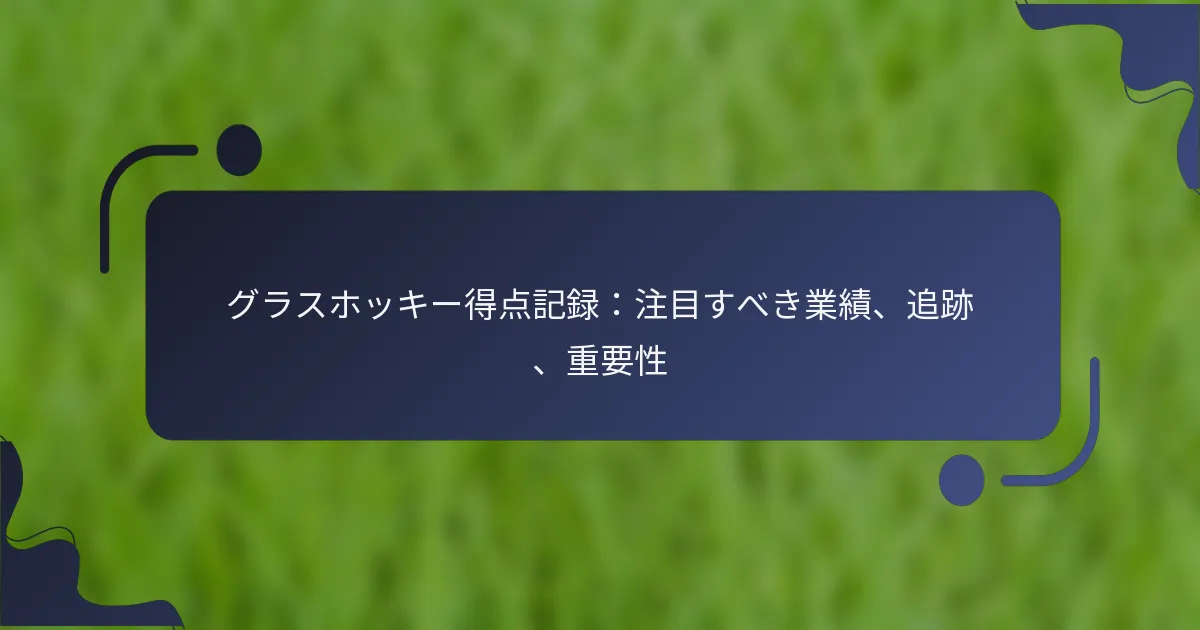 グラスホッケーは、その選手やチームの卓越した才能を称える得点記録の豊かなタペストリーを誇っています。これらの記録は、公式組織や先進技術によって慎重に追跡され、さまざまな競技における個人の偉業やチームのマイルストーンを捉えています。その重要性は単なる統計を超え、チーム戦略に影響を与え、ファンの関与を高め、スポーツの活気ある歴史を形作っています。 グラスホッケーにおける注目すべき得点記録は何ですか? グラスホッケーには、選手やチームの卓越した才能を際立たせる得点記録の豊かな歴史があります。これらの記録は、個人の成果、チームのマイルストーン、国際大会における重要なパフォーマンスにわたり、スポーツの競争的な性質を示しています。 選手によるキャリア最高得点 グラスホッケーにおけるキャリア最高得点者は、驚異的な偉業を達成し、しばしば将来の世代にインスピレーションを与える基準を設定しています。テュン・デ・ノイジャーやジェイミー・ドワイアのような選手は、キャリアトータルで数百点に達し、スポーツの伝説となっています。 キャリアゴールを追跡するには、得点数だけでなく、プレイした試合数も考慮する必要があります。これにより、選手の得点効率に関する文脈が提供されます。トップスコアラーは通常、時間の経過に伴うスキルと一貫性を反映した得点平均を維持しています。 1シーズンでの最多得点 グラスホッケーにおける1シーズンの得点記録は驚異的であり、選手は時折、20点台後半または30点台前半に達することがあります。これらの記録は、試合数が多く得点機会が増える国内リーグで達成されることが多いです。 1シーズンの得点記録を破るためには、選手はスキルだけでなく、シーズンを通じて怪我をせず、ピークの身体状態を維持する必要があります。この要素の組み合わせが、これらの偉業を注目すべきものにし、スポーツ内で祝われる理由です。 国際大会での最多得点記録 国際大会での最多得点記録は、プレッシャーの中でパフォーマンスを発揮する選手の能力を証明しています。ソハイル・アッバスのような選手は、高い基準を設定し、複数のワールドカップやオリンピックで多数の得点を挙げています。 これらの記録は、選手が国際舞台で与える影響を反映しており、しばしば名誉あるイベントでのチームの成功に影響を与えます。大会で高得点を達成するには、卓越したスキル、戦術的な意識、得点機会を活かす能力が必要です。 伝説的な選手による注目すべき業績 グラスホッケーの伝説的な選手は、得点記録を打ち立てるだけでなく、スポーツの歴史に重要な貢献をしています。複数回の年間最優秀選手賞を受賞したり、チームをチャンピオンシップの勝利に導いたりする業績は、エリート選手の間で一般的です。 これらの選手は、献身、スキル、スポーツマンシップを通じて他の選手にインスピレーションを与え、グラスホッケーの未来を形作る持続的な遺産を残します。彼らの記録や栄誉は、将来のアスリートにとっての基準となります。 主要選手権におけるチーム得点記録 主要選手権におけるチーム得点記録は、成功したチームの集団的な強さと戦略を強調しています。たとえば、特定のチームはトーナメント中に高得点を達成し、その攻撃力とチームワークを示しています。 これらの記録は、成功したチームのダイナミクスを理解するために分析されることが多く、プレースタイルや戦術を含みます。選手権で一貫して高得点を挙げるチームは、スキルのある選手と効果的なコーチング戦略の強力な組み合わせを持つ傾向があります。 グラスホッケー得点における歴史的マイルストーン グラスホッケー得点における歴史的マイルストーンは、スポーツを形作った重要な瞬間を示しています。これらのマイルストーンには、特定の得点数に達した最初の選手や、連勝記録を樹立したチームが含まれることがあります。 これらのマイルストーンを認識することは、ゲームの進化と選手が達成を目指す基準を理解するために重要です。これらは、スポーツの豊かな歴史と、世界中のアスリートによる卓越性の追求を思い出させるものです。 グラスホッケーの得点記録はどのように追跡されますか? グラスホッケーの得点記録は、公式組織、検証方法、先進技術の組み合わせを通じて追跡されます。これらの要素は、さまざまな競技における選手やチームの正確で信頼できる統計を確保するために協力しています。 記録管理を担当する公式組織 グラスホッケーの得点記録を維持する主な組織には、国際ホッケー連盟(FIH)や、USAフィールドホッケー、イングランドホッケーなどの国内統括団体が含まれます。これらの組織は、記録管理の基準を設定し、競技間の一貫性を確保します。