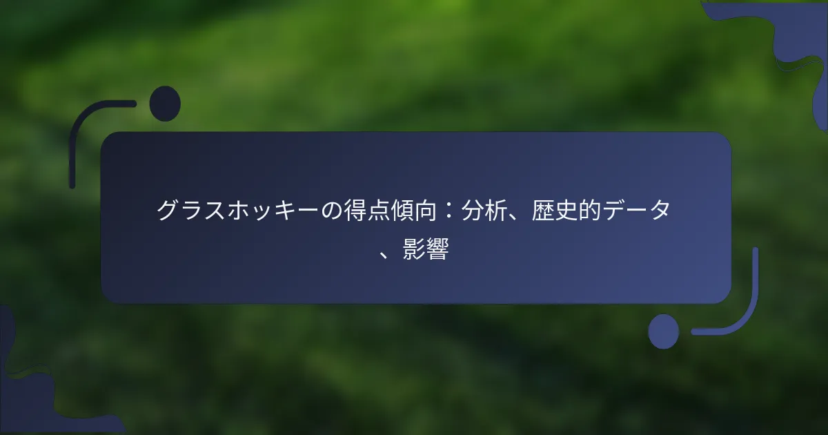 グラスホッケーの得点傾向は、選手のスキル向上や戦略的なプレーによって、近年目立ったゴール平均の増加を示しています。これらの傾向を分析することは、パフォーマンスを向上させ、急速に進化するスポーツで競争力を維持しようとするチームにとって重要です。 グラスホッケーにおける主要な得点傾向は何ですか? グラスホッケーにおける主要な得点傾向は、選手のスキル開発や戦術の変化など、さまざまな要因の影響を受けて、近年ゴール平均が徐々に増加していることを示しています。これらの傾向を理解することは、パフォーマンスを向上させ、進化するゲームに適応しようとするチームにとって不可欠です。 最近の得点平均とパターン ここ数シーズン、グラスホッケーの試合あたりの平均ゴール数は上昇しており、通常は4から6ゴールの範囲です。この増加は、攻撃戦略の改善や選手のコンディショニングによるものです。 チームは現在、より速いペースのプレーと迅速なトランジションに焦点を当てており、これが得点機会の増加につながっています。攻撃的なフォーメーションへの傾向も、この得点の増加に寄与しています。 得点に影響を与える要因 選手のスキル開発:向上したトレーニング技術とより良いコーチングへのアクセスが、個々の選手のパフォーマンスを向上させ、より効果的な得点につながっています。 戦術の進化:チームは、得点チャンスを最大化するフォーメーションを利用して、よりダイナミックな戦略を採用しています。 機器の進歩:スティック技術や防具の改善により、選手はより正確かつ強力にシュートできるようになりました。 競争の激化:競争の激しいリーグの台頭が、チームにスキルを磨くことを促し、得点の多い試合を生み出しています。 過去の10年間との比較 年代 試合あたりの平均ゴール数 1980年代 2-3 1990年代 3-4 2000年代 3-5 2010年代 4-5 2020年代 4-6 過去数十年にわたり、試合あたりの平均ゴール数は着実に増加しています。1980年代は得点が低く、平均してわずか2から3ゴールでしたが、現在の10年間では平均が4から6ゴールに上昇しています。