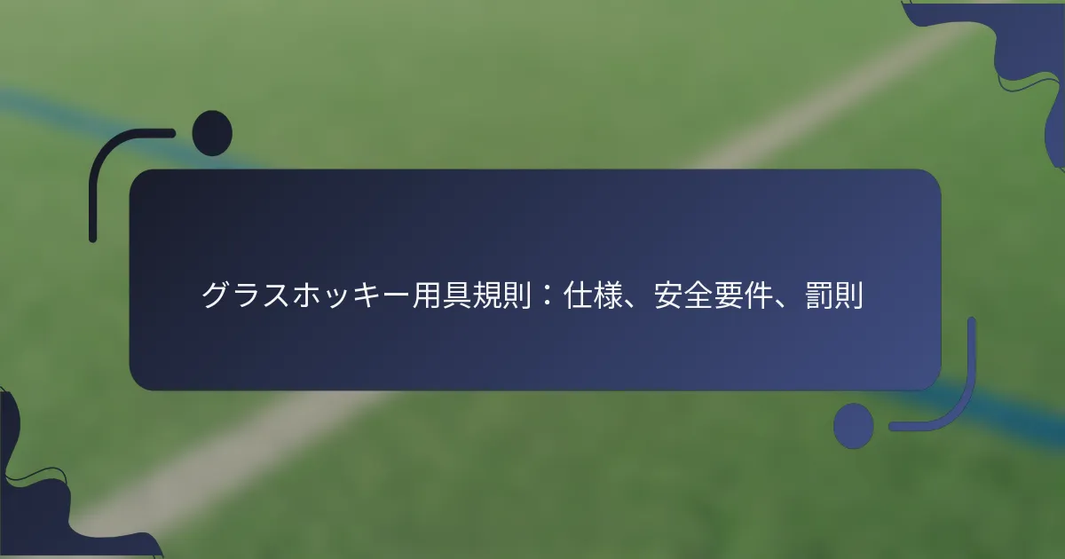 グラスホッケーの用具は、フィールドでのパフォーマンスと安全性を確保するために厳格な仕様に従っています。これらの基準を遵守することは重要であり、スティックやボールの寸法や材料、必要な保護具を規定しています。これらの規則に従わないと、選手の参加やチームのパフォーマンスに影響を与える罰則が科される可能性があります。 グラスホッケー用具の仕様は何ですか? グラスホッケー用具は、パフォーマンスと安全性のために特定の基準を満たさなければなりません。これらの仕様は、スティックやボールの寸法と材料、保護具の要件、およびデザインの遵守機能をカバーしています。 グラスホッケースティックの寸法と材料 グラスホッケースティックの長さは通常36.5インチから38インチ(約92cmから97cm)です。ブレードの幅は、プレイ中の適切なコントロールと操作性を確保するために3.5インチ(約9cm)を超えてはいけません。 スティックは一般的に木材、ファイバーグラス、またはカーボンファイバーなどの材料で作られています。各材料は異なる利点を提供します。たとえば、木材は伝統的な感触を提供し、カーボンファイバーは軽量で耐久性が向上します。 選手は、競技用に適したスティックを確保するために、規制機関が定めた規則に準拠したスティックを選ぶべきです。パフォーマンス基準を維持するためには、定期的に摩耗や損傷をチェックすることが重要です。 グラスホッケーボールの仕様 グラスホッケーボールは通常、固体プラスチックで作られ、重さは156グラムから163グラムの間でなければなりません。ボールの直径は通常約23cmで、試合中の最適なコントロールとスピードを可能にします。 これらのボールは耐久性があり、天候に強いため、さまざまなプレイ条件に適しています。選手は、使用するボールに欠陥がなく、公式試合のための必要な仕様を満たしていることを確認する必要があります。 ボールの損傷や摩耗の兆候を定期的に検査することは、プレイ中の安全性とパフォーマンスを維持するために重要です。 保護具の要件 保護具はグラスホッケーにおける選手の安全に不可欠です。必須の装備には、すね当て、マウスガード、そしてプレイ中の怪我を防ぐための適切なフットウェアが含まれます。 すね当てはしっかりとフィットし、すね全体を覆う必要があります。一方、マウスガードは最適な保護を提供するためにカスタムフィットであるべきです。フットウェアは、芝生の表面でのパフォーマンスを向上させるために、良好なグリップとサポートを提供する必要があります。 選手は、試合中の最大限の安全を確保するために、保護具の摩耗を定期的にチェックし、損傷の兆候があるアイテムは交換することを推奨されます。 準拠した用具のデザイン機能 すべてのグラスホッケー用具は、準拠と見なされるために特定のデザイン機能に従わなければなりません。これには、スティックがボールコントロールのために平らな側面を持ち、ブレードが正確なパスやシュートを促進するように設計されていることが含まれます。 さらに、用具は怪我を引き起こす可能性のある鋭いエッジや突起物がないことが求められます。すべての装備が確立された安全基準を満たしていることを確認するために、定期的な遵守チェックが必要です。 選手は、競技中の罰則を避けるために、規制機関が定めたデザイン要件に精通しておくべきです。 用具仕様を管理する規制機関 国際ホッケー連盟(FIH)は、グラスホッケー用具仕様を監督する主要な規制機関です。彼らは、すべての選手と製造業者が遵守しなければならないルールと規則を定めており、公正なプレイと安全性を確保しています。 FIHに加えて、各国のホッケー連盟は国際基準に沿った独自の特定のルールを持っている場合があります。選手は、適用される追加の要件について地元の規制機関に相談するべきです。 最新の規則について情報を得ることは、選手やチームが罰則を避け、競技中に遵守を確保するために重要です。 グラスホッケー用具の安全要件は何ですか? グラスホッケー用具は、試合中に選手を保護するために特定の安全要件を満たさなければなりません。これらの要件には、認証された保護具の使用と、怪我のリスクを最小限に抑えるために確立された遵守基準の遵守が含まれます。